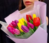 Букет из 15 тюльпанов микс. Флорист подберет цвета из имеющихся в наличии. Оформление: цветы укладываются спиралью в упаковку. По желанию добавим зелень — стоимость уточните у администратора