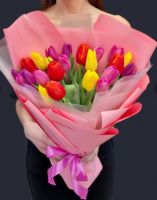 Букет из 25 тюльпанов микс. Флорист подберет цвета из имеющихся в наличии. Оформление: цветы укладываются спиралью в упаковку. По желанию добавим зелень — стоимость уточните у администратора.